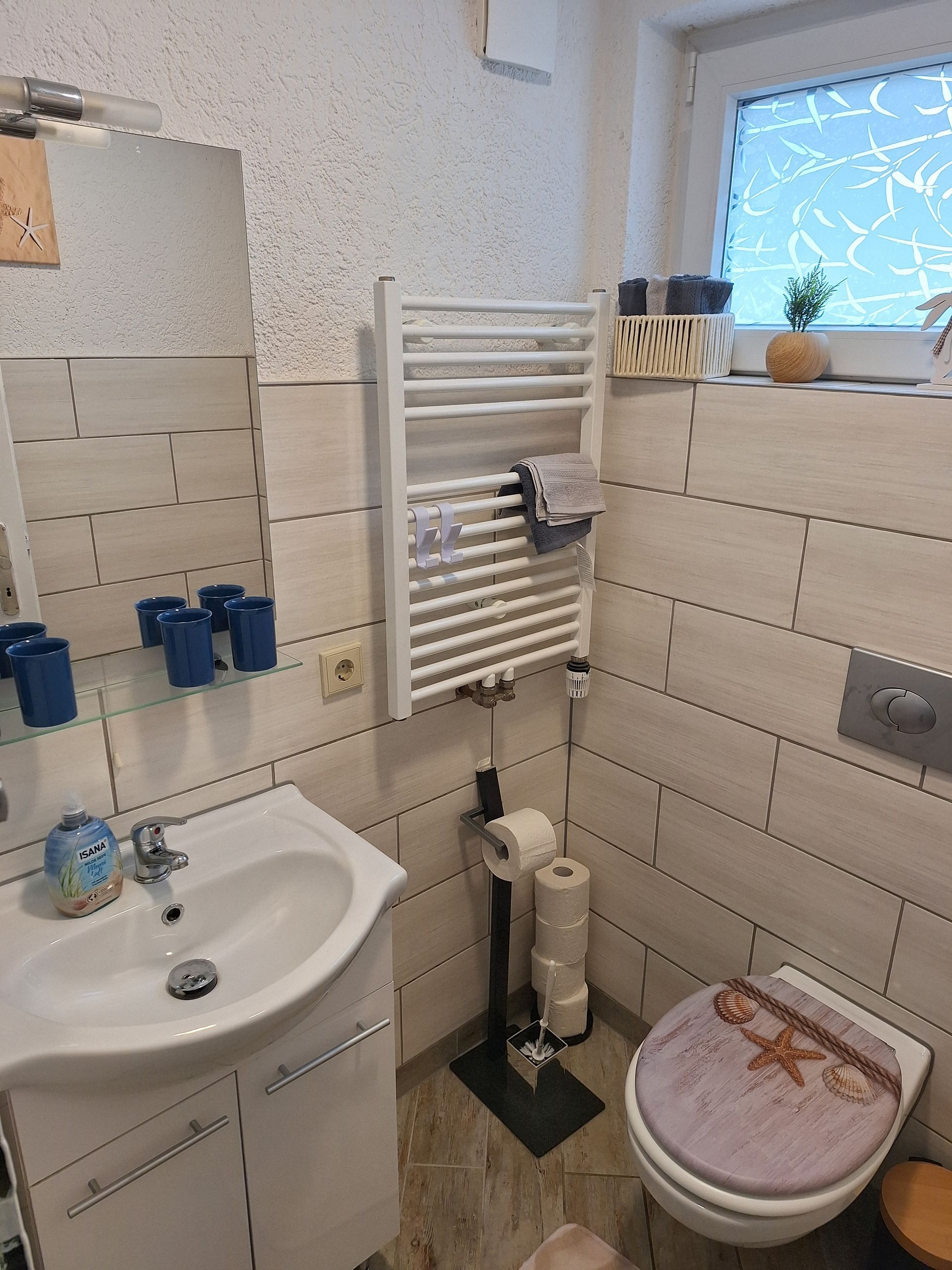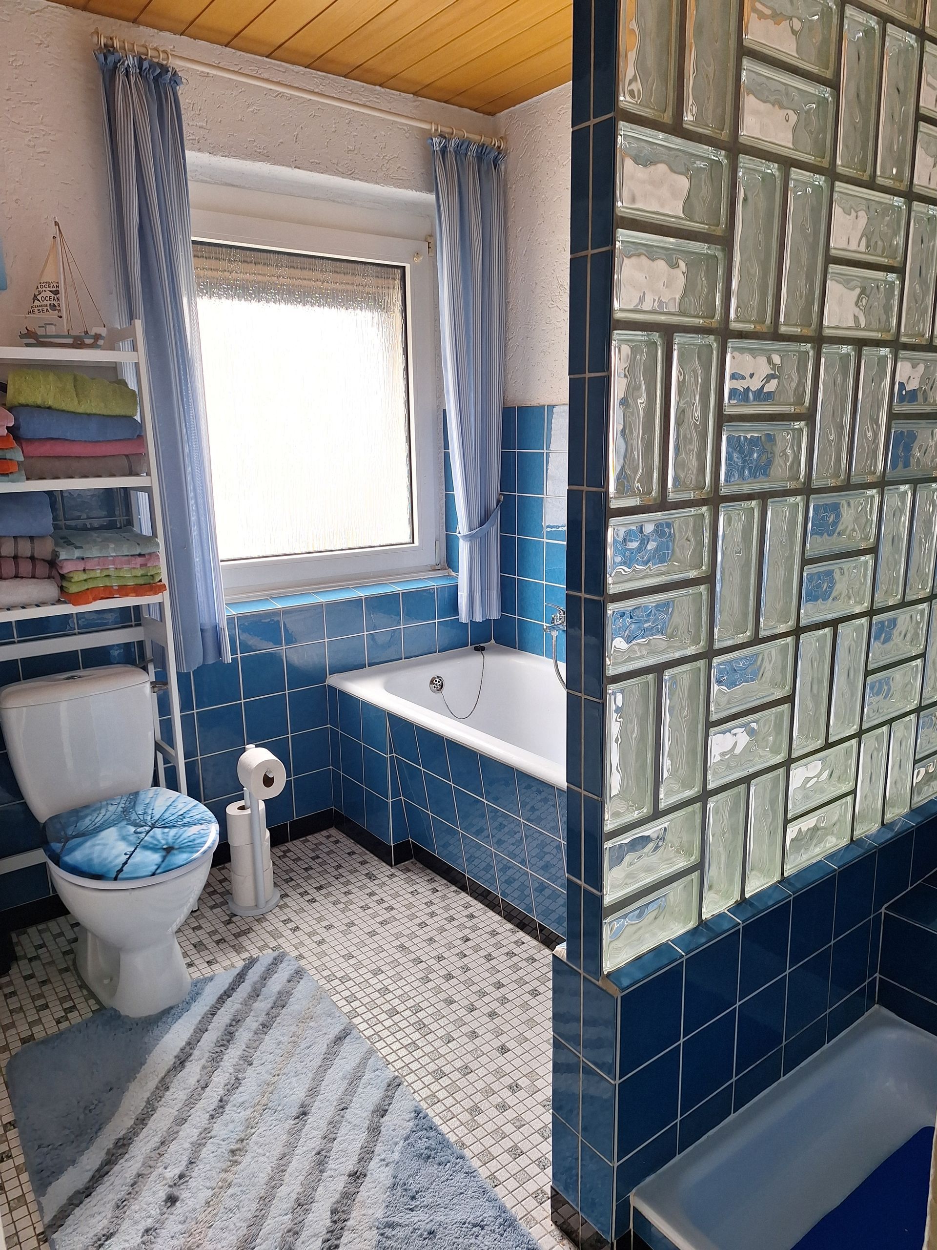 - Badezimmer mit Waschplatz, WC, Badewanne und Dusche